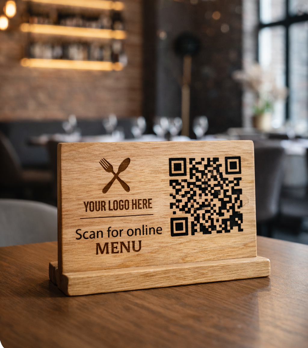 Elegantni drveni QR stalak koji gostima omogućava brz pristup za digitalni meni, Wi-Fi lozinku, Instagram profil, Google recenzijama – jednim skeniranjem. Dodajte gravuru svog logoa ili naziva lokala i podignite utisak brenda na svakom stolu. Mogućnost izrade digitalno web menija.