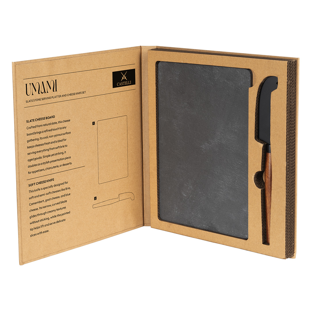 Set UMAMI sadrži kamenu ploču za serviranje i nož za sir sa drvenom drškom, što ga čini odličnim izborom za meze plate, degustacije i kućna okupljanja. Kamena podloga daje premium izgled i stabilnu površinu za serviranje, dok nož olakšava sečenje i posluživanje različitih vrsta sireva. Set dolazi u poklon pakovanju, pa je idealan i kao poslovni ili lični poklon.